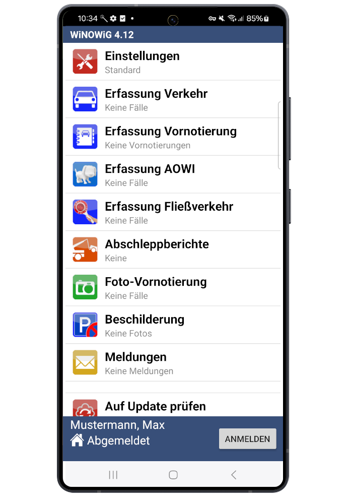 Mit der APP WiNOWiG.mobil werden allgemeine und Verkehrsordnungswidrigkeiten schnell und einfach mit dem Smartphone erfasst. Übersichtliche Masken, zahlreiche Auswahllisten und der hinterlegte bundeseinheitliche Tatbestandskatalog erleichtern die Handhabung. Die Kennzeichenerkennung vermeidet Erfassungsfehler. Sie entscheiden, ob Sie das Knöllchen drucken möchten oder das WiNOWiG Online-Knöllchen anwenden, die smarte Benachrichtigungskarte mit individuellem QR-Code