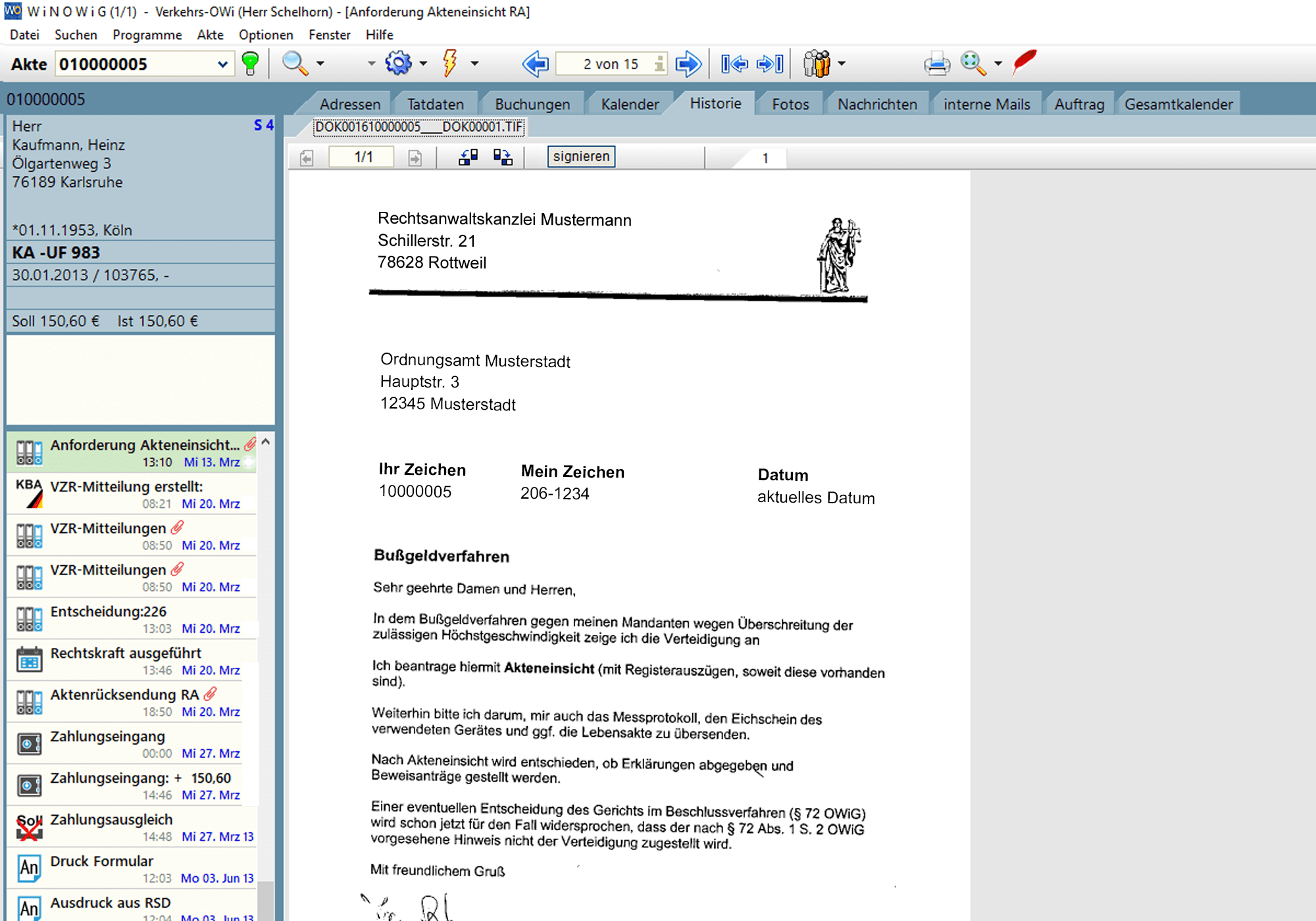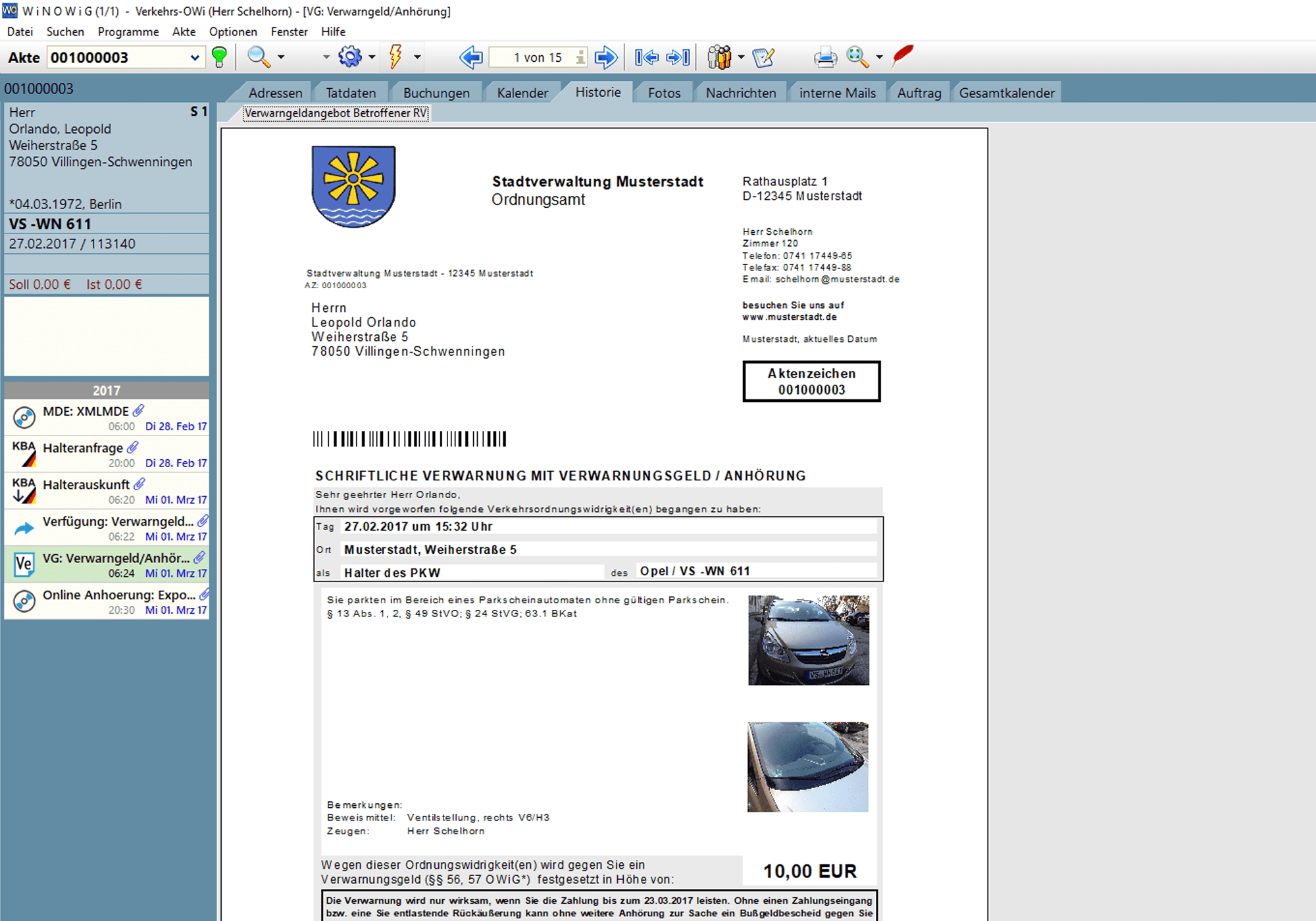 Komfortable Unterstützung bei der Erfassung und Verfügung von Fällen mit Tateinheit und kombinierter Tatein- und Tatmehrheit Einbindung von Fotos. Die Fotos werden per Schnittstelle aus dem jeweiligen Vorverfahren übergeben (mobile Datenerfassung, Filmauswertung Geschwindigkeit / Rotlicht) oder werden nachträglich manuell den Verfahren zugeordnet. Druck der Fotos in allen Schriftstücken möglich.